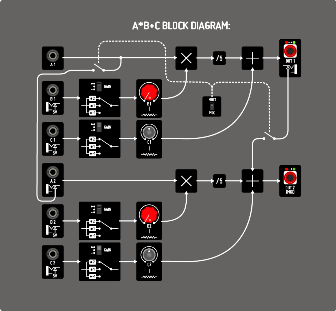 A*B+C is the ultimate utility for audio and control voltage. It performs multiplication, addition, and attenuation, providing a simple way to create complex signal interactions and timbres.