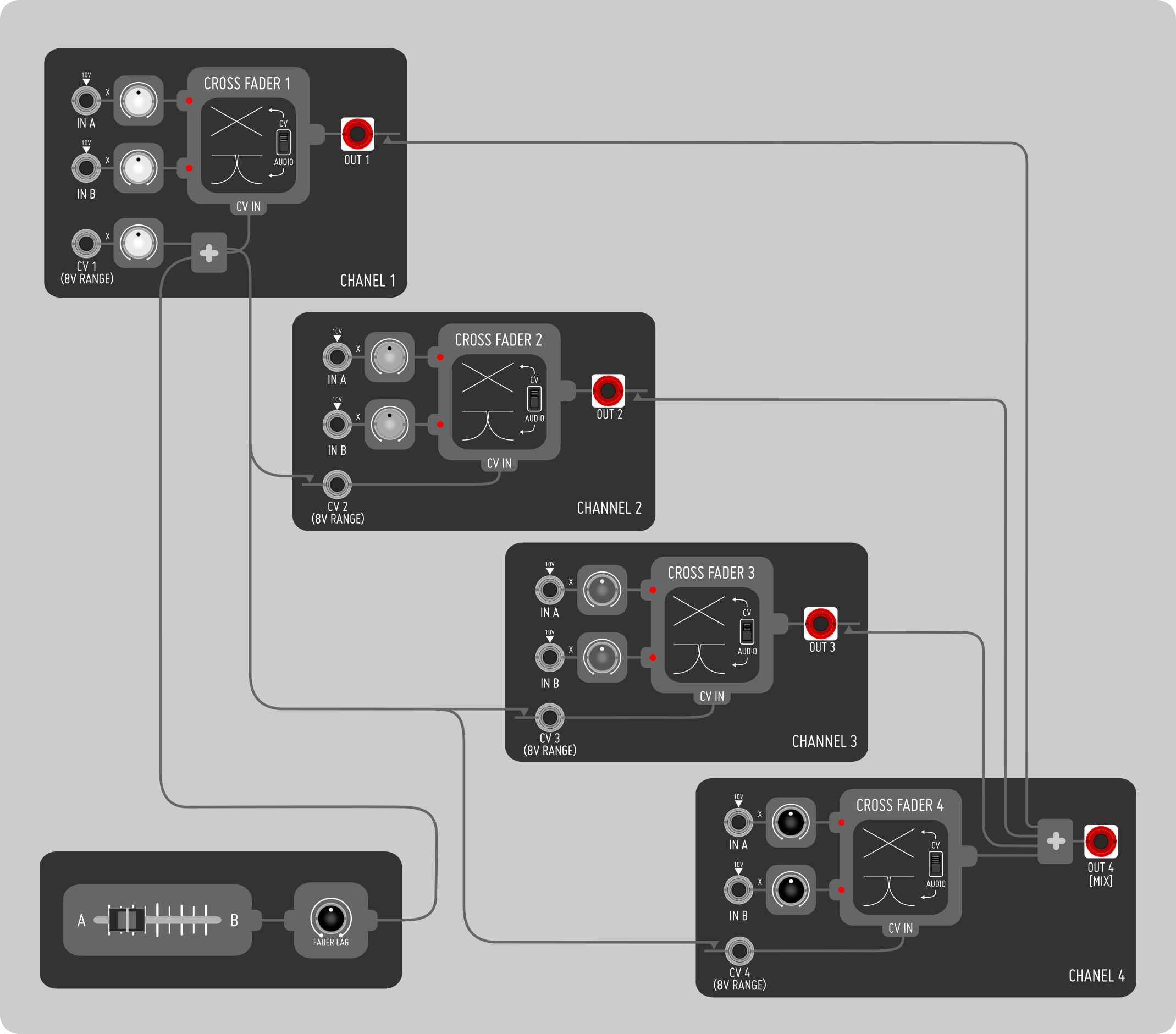 - CV Controlled four channel crossfader